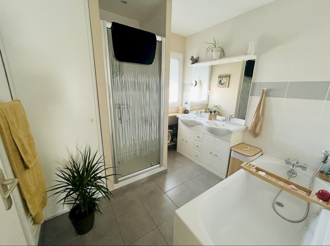 • À l’étage un palier desservant 3 chambres spacieuses avec rangements intégrés, SDB avec meuble double vasque, douche et baignoire et WC séparé.