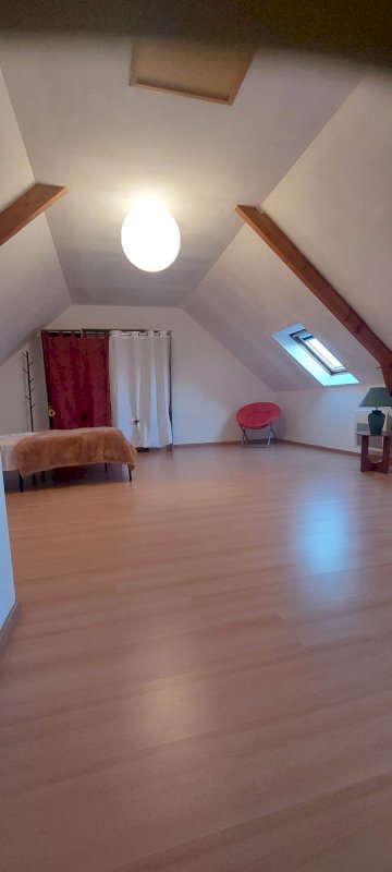 Un bel escalier en bois exotique mène à l'étage où vous découvrirez deux chambres lumineuses dont une spacieuse de 20 m², ainsi qu’un grenier offrant un espace de rangement appréciable.
