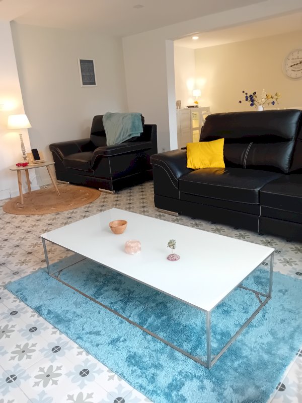 Cuisine aménagée équipée neuve ouverte, gde Pièce de vie Salon & coin repas.