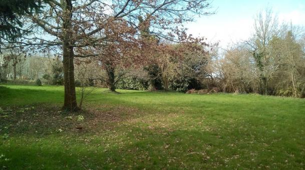Parc avec arbres fruitiers, chênes, et sapins.