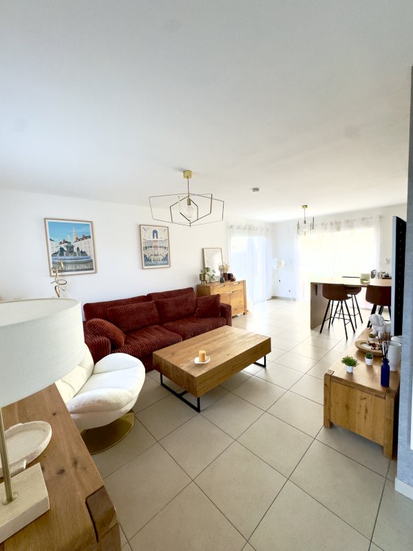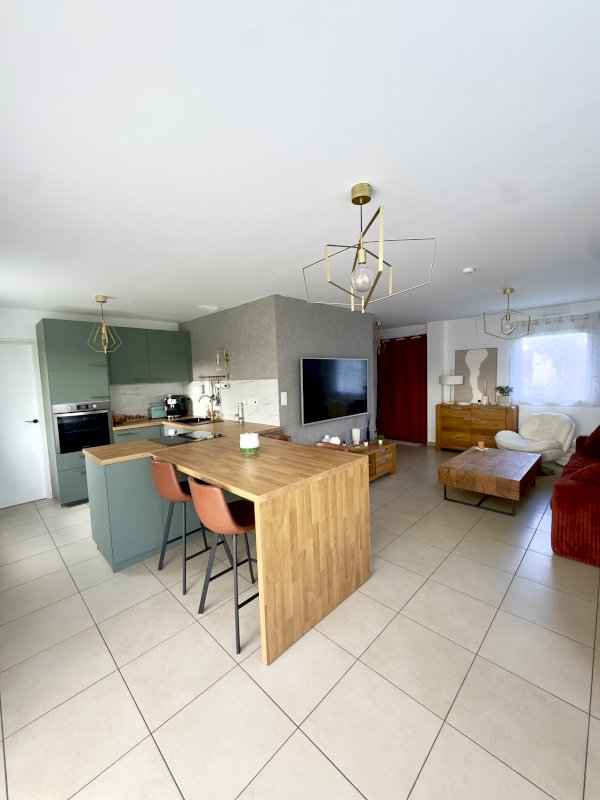 • Au rez-de-chaussée, une belle pièce de vie séjour/salon/cuisine lumineuse orientée sud, avec une cuisine équipée, ilot et espace repas central, la pièce est traversante et très lumineuse.