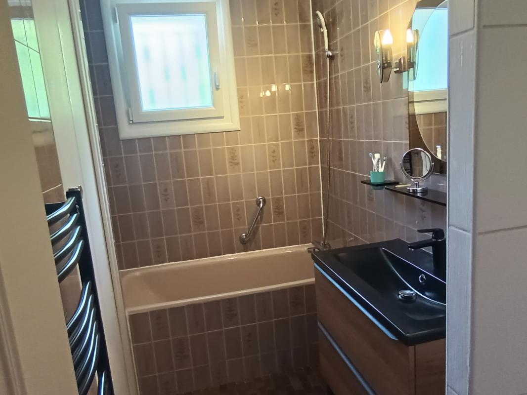 WC, Salle de bains avec Fenêtre en PVC neuf avec châssis oscillo-basculant un placard, sol en carrelage. Mur carreler jusqu’au plafond. Radiateur sèche serviette.