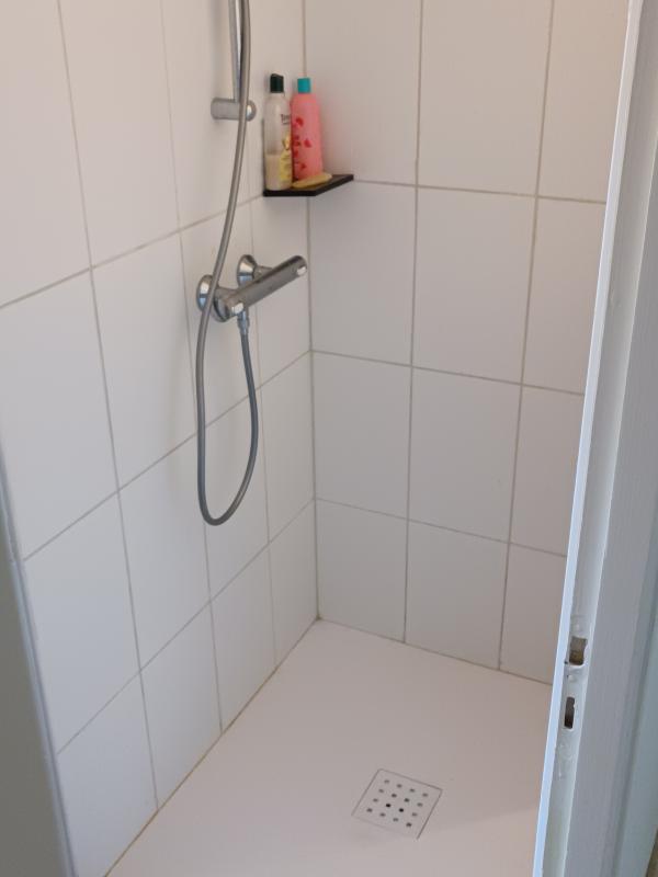 Baignoire, meuble avec lavabo neuf, ensemble miroir et étagère sur le lavabo, Douche à l’italienne neuve.