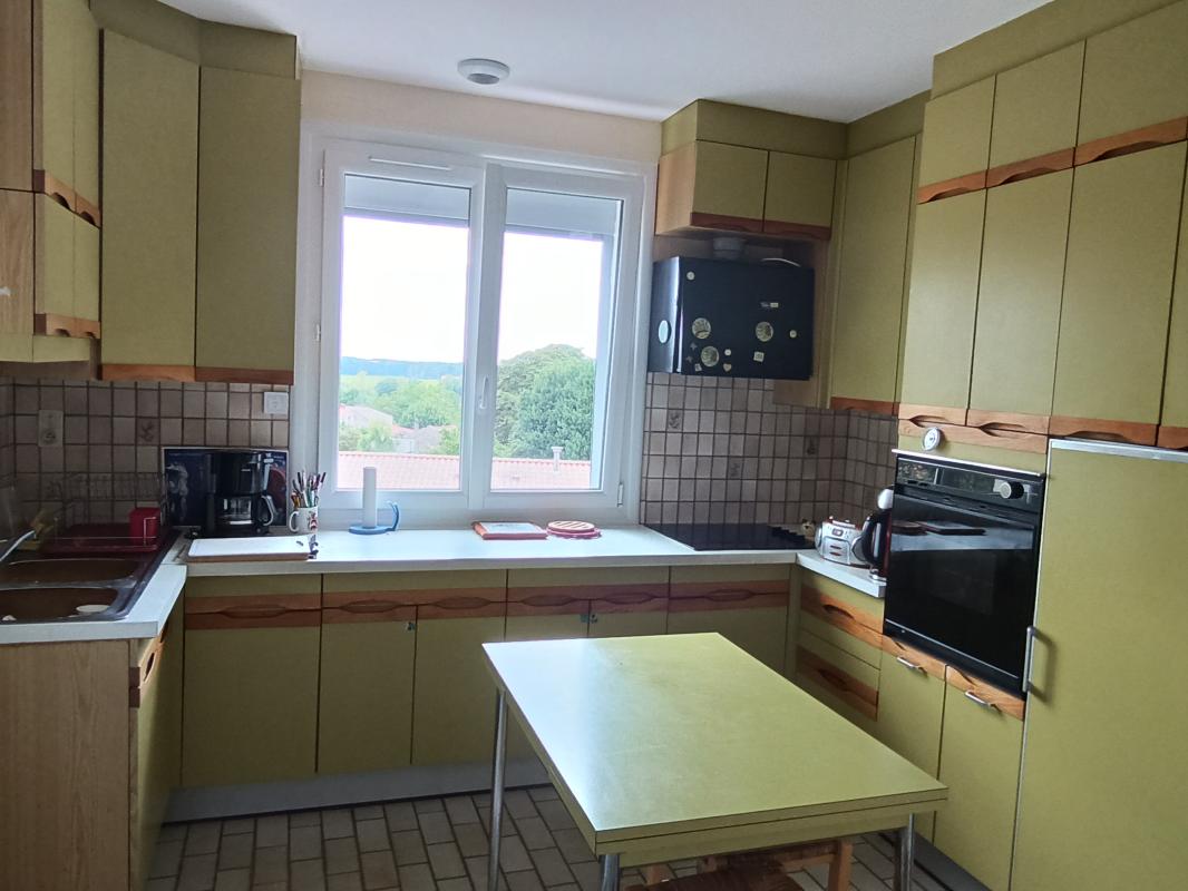 Fenêtre en PVC neuf avec un côté oscillo-basculant. Arrière cuisine avec deux placards don un meuble suspendu à trois rangements. Escalier, pour accéder au garage et sous-sol.