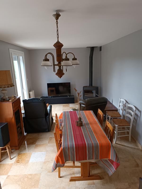 Pièce à vivre avec bibliothèque intégrée deux portes fenêtres menuiseries en PVC neuf. Poêle à bois disposé au fond de la salle. Chauffage avec radiateur à fluide caloporteur.