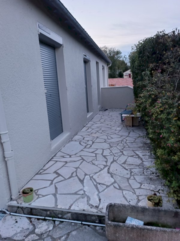 L’habitation se situe au-dessus du garage de plein pied avec isolation du plancher. Pour accéder deux solutions sont disponibles des escaliers côté gauche et une pente régulière autour de l’habitation qui arrive sur la terrasse coté droit.