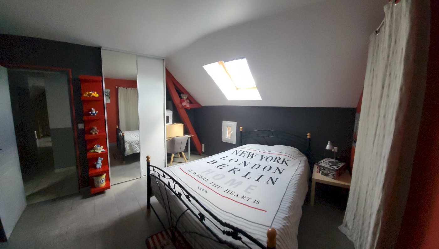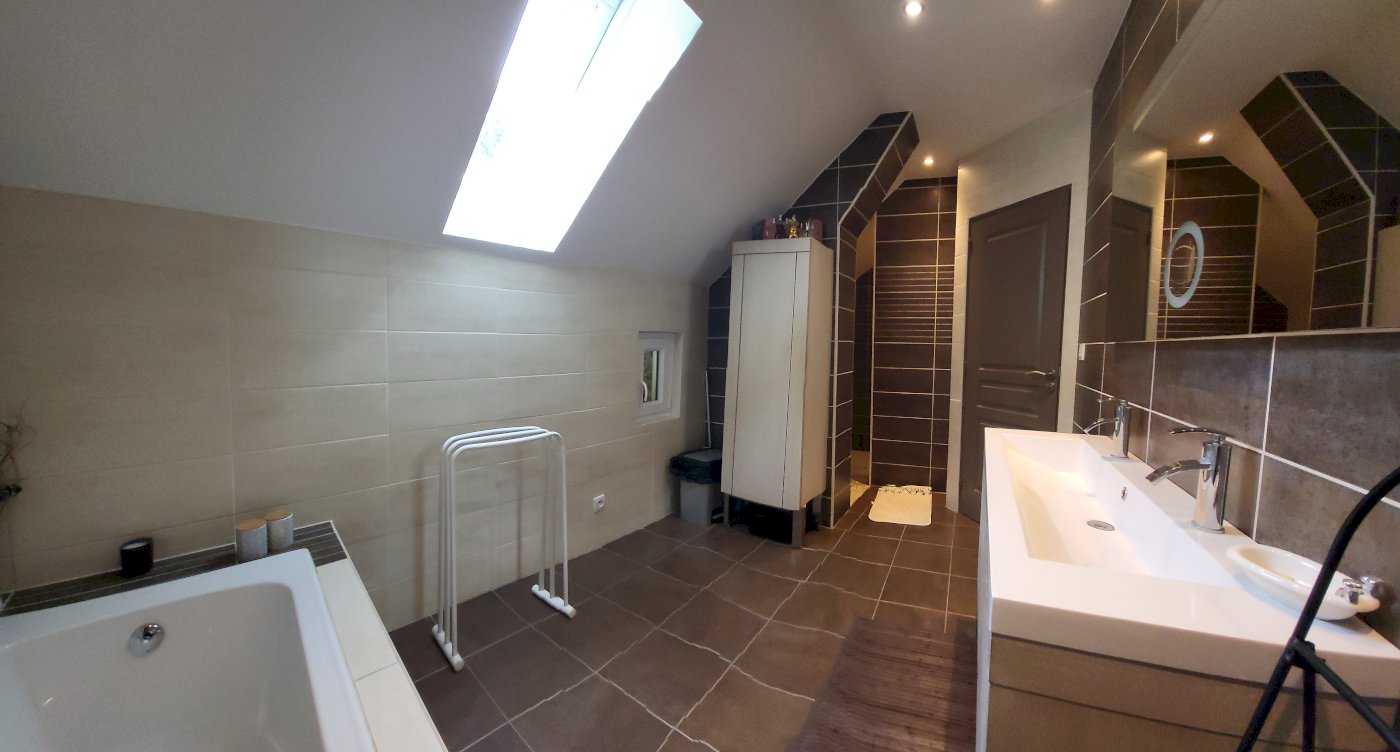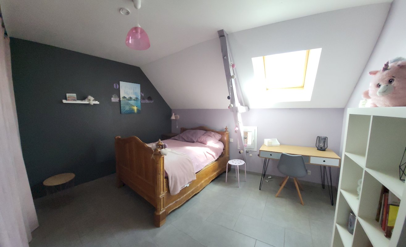 • A l’étage : 3 chambres de 13 à 14m² avec placard, une salle de bain, un WC, un dégagement, couloir avec placard.