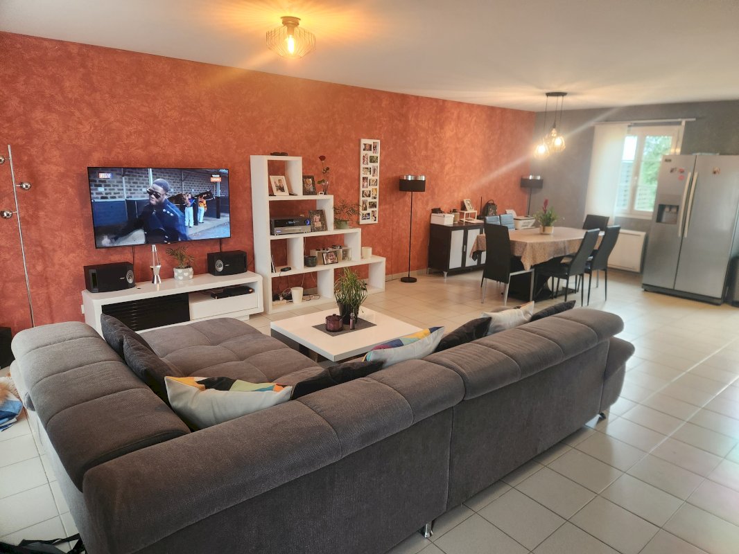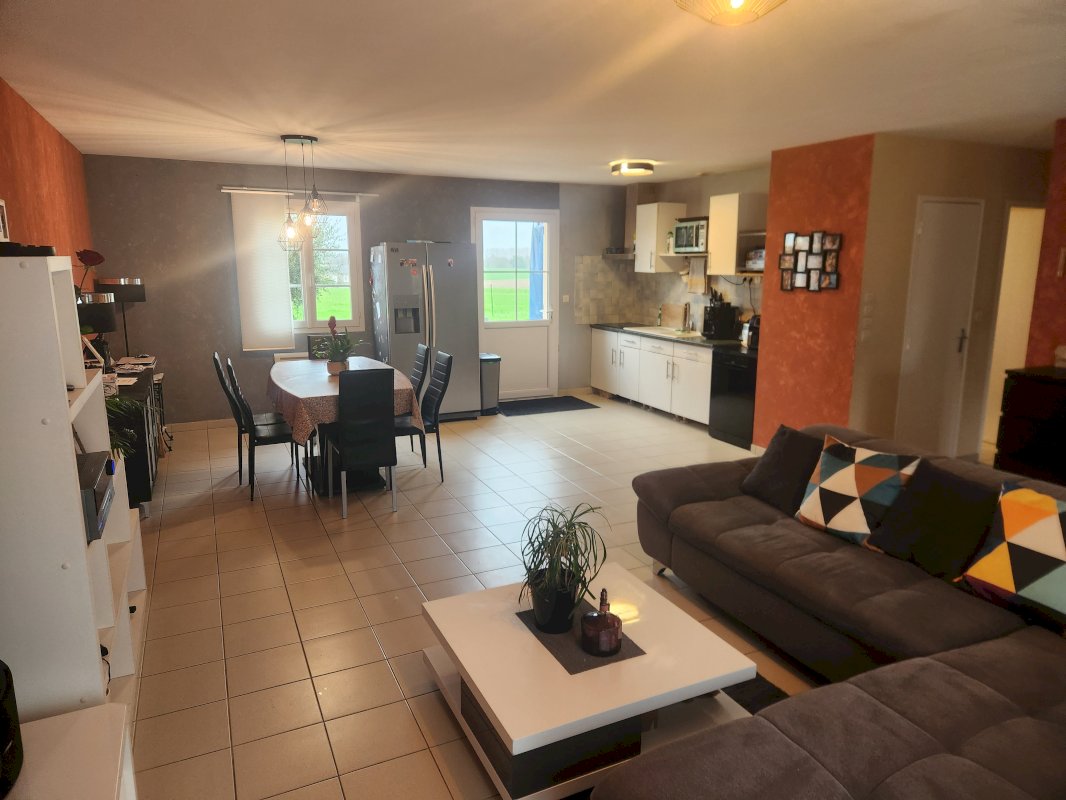 Maison récente à faible consommation énergétique comprenant grande pièce de vie avec cuisine ouverte de 45 m², un espace nuit qui dessert une salle de bain, 3 chambres : une de 12 m² avec placard, une de moins de 9 m² et une suite parentale de 25 m² avec salle d’eau. Une buanderie pour machine a laver et rangement. Moustiquaire en rideaux aluminium sur chaque fenêtres.
