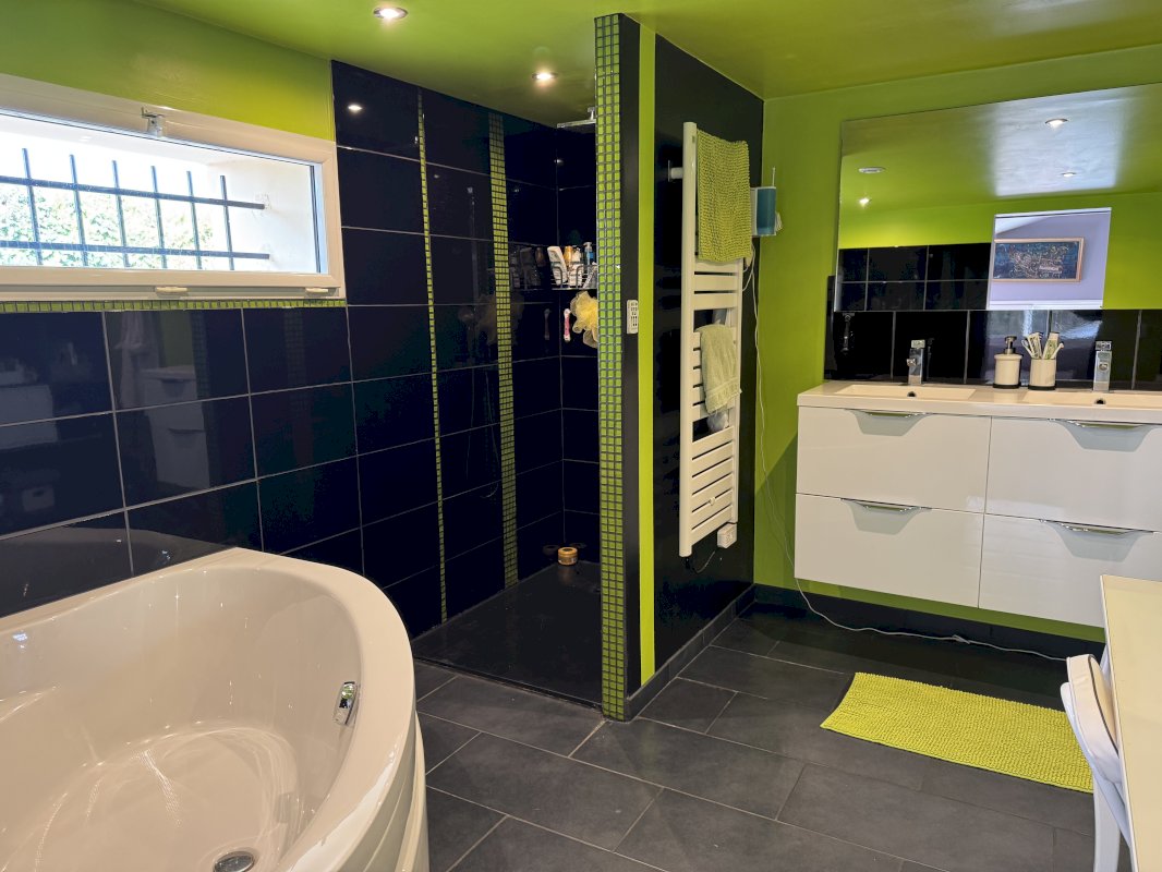 1 salle de bains avec douche à l'Italienne, baignoire d'angle et WC.