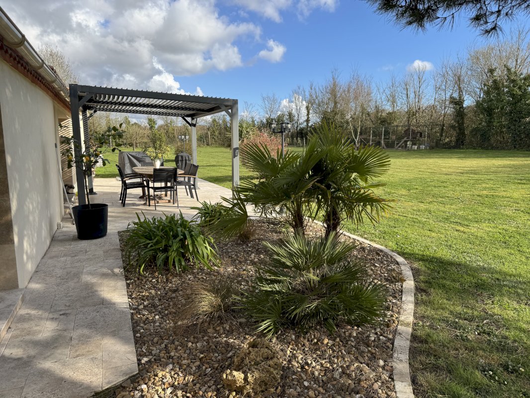 1 séjour avec baies à galandages donnant accès à une terrasse en pierre de 45 m², partiellement abrité par une pergola bio climatique.