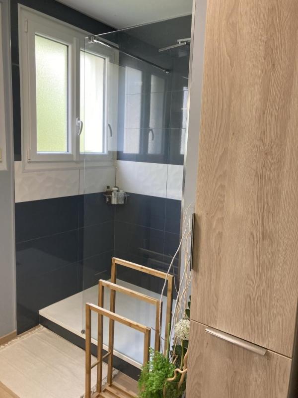 Une salle d’eau avec 2 fenêtres qui allie confort, qualité et esthétique (double vasque, divers rangement, douche avec mitigeur thermostatique).