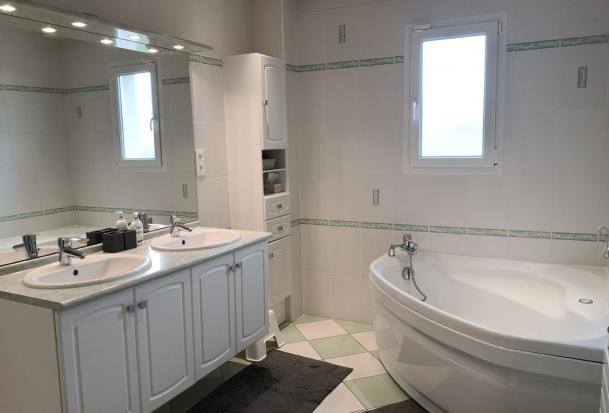 - 1 salle de bain avec douche, baignoire d’angle, double vasque et fenêtre,
