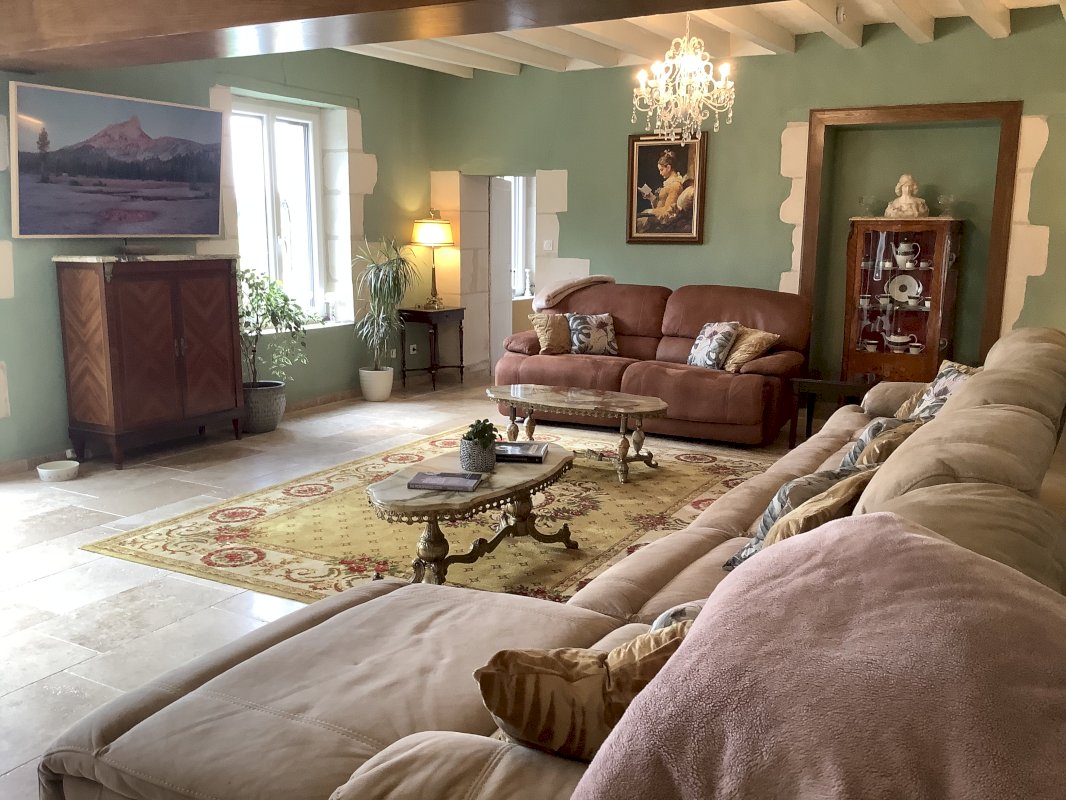 En entrant dans la maison, vous serez accueilli par un hall d'entrée accueillant avec un vestiaire. Le vaste espace de vie, qui s'étend sur plus de 100 mètres carrés, est un délicieux mélange de confort et d'élégance. Un salon confortable avec un poêle à bois, une salle à manger spacieuse et une superbe cuisine de style campagnard créent une atmosphère invitante pour recevoir et se détendre. La cuisine, équipée d'une plaque de cuisson au gaz, de pierres de tuffeau et de carreaux de terre cuite, est un véritable havre de paix culinaire. Une buanderie séparée ajoute à l'aspect pratique de cet espace.