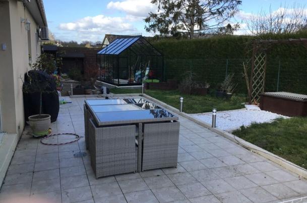A l'extérieur, un double garage dont une partie transformée en atelier (plans de travail et nombreux placards), bassin entièrement sécurisé, une serre neuve en verre trempé de 7,5 m², une grande terrasse, un potager aménagé et de nombreux arbres et arbustes fruitiers.