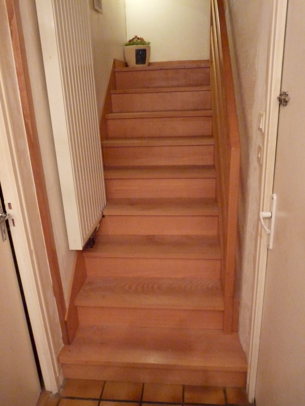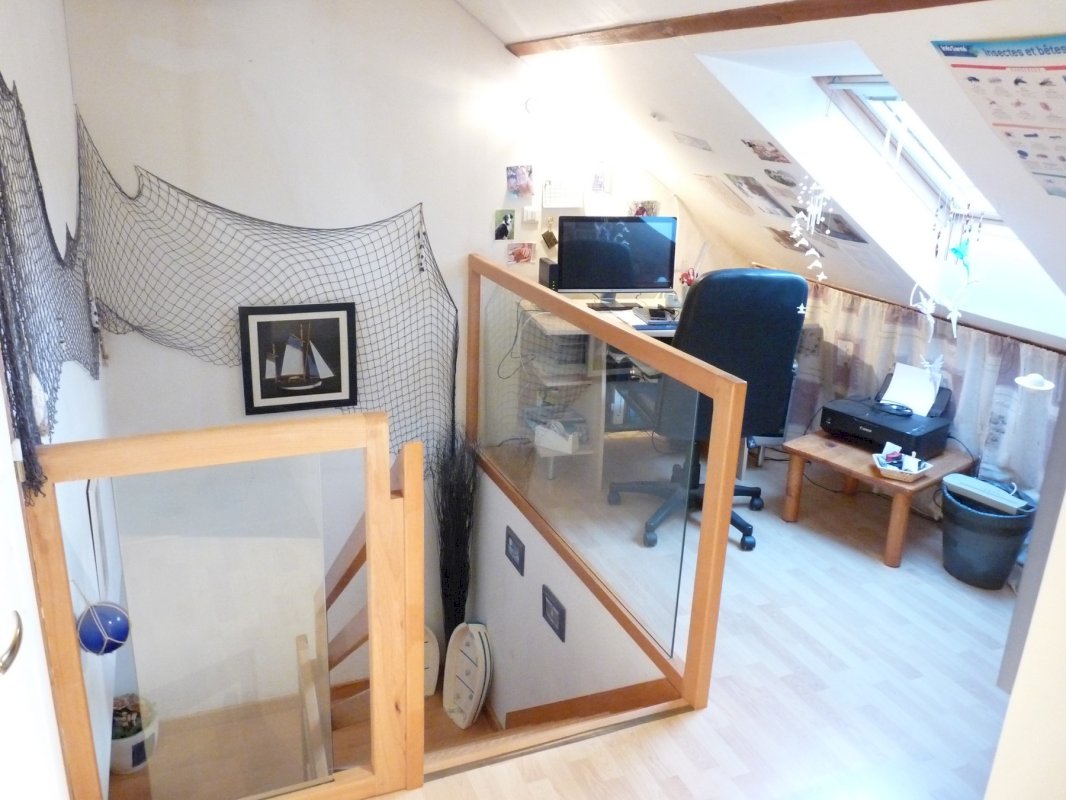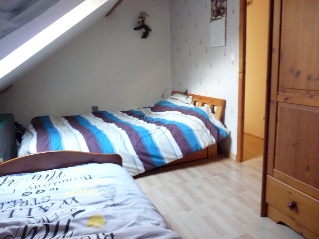 Étage sur plancher béton, accès par escalier en hêtre, pièce palière, SDB de 10 m² avec douche, baignoire, WC et lavabo, chambre de 16 m² habitable (27 m² au sol) équipée de placards, 2 autres pièces de 8 et 11 m² au sol, l'une est utilisée en chambre d'appoint avec 2 lits...