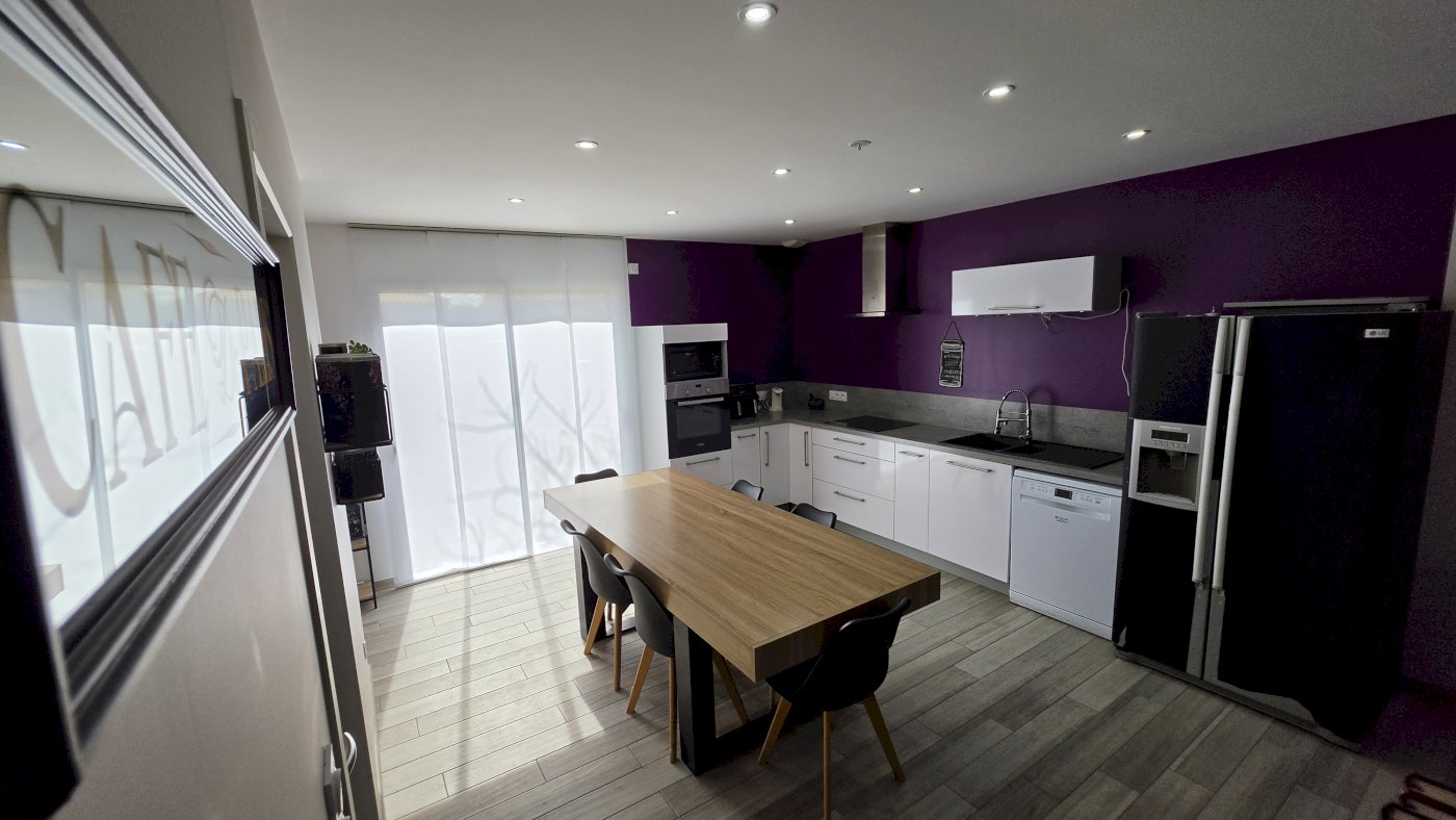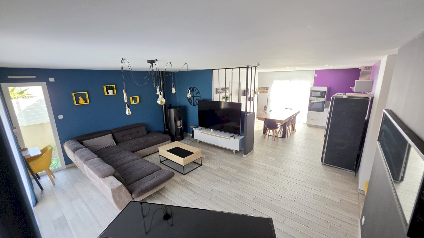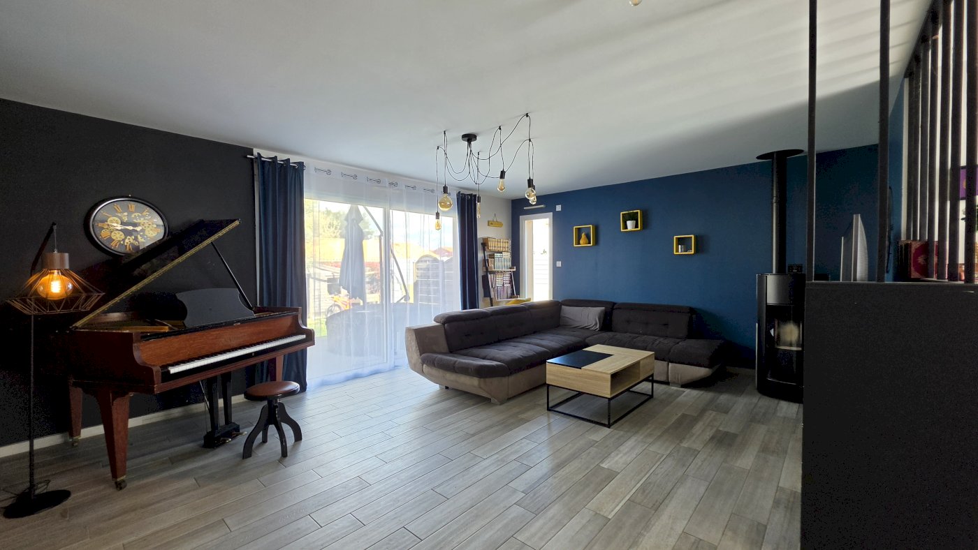 De plain-pied, la maison offre une belle pièce de vie lumineuse avec cuisine ouverte, idéale pour les moments de convivialité en famille ou entre amis.