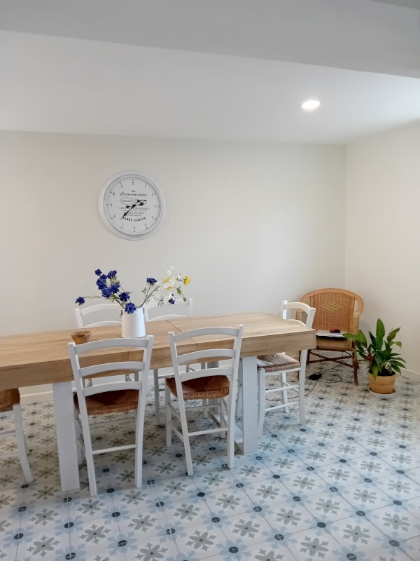 Cuisine aménagée équipée neuve ouverte, gde Pièce de vie Salon & coin repas.