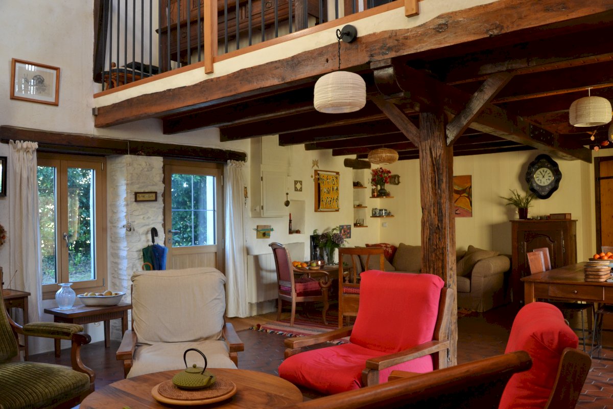 Rez-de-chaussée : grand salon/séjour de 45 m² avec cheminée insert, chambre de 14 m², cuisine très lumineuse de 12,5 m², espace de rangement, salle d'eau avec wc et petite buanderie.