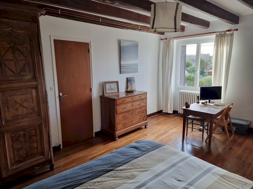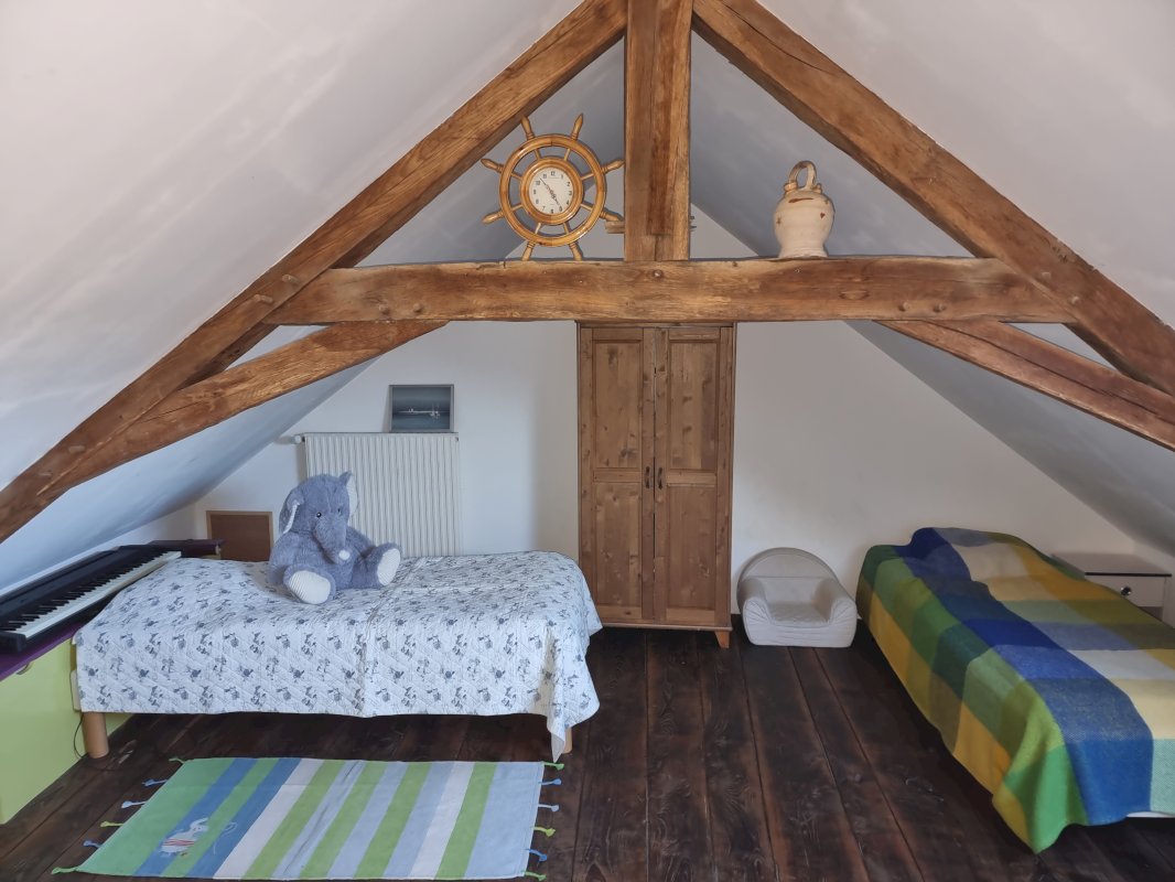 - À l’étage : 3 chambres, petite pièce à usage multiple (chambre de bébé, atelier couture, salle de jeu…), wc, salle de bains à rénover ;