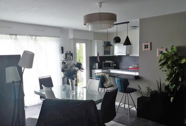- une cuisine ouverte aménagée et équipée (four – plaque – hotte – lave-vaisselle – frigo) de 7,95 m² – radiateur électrique – baie double vitrage.