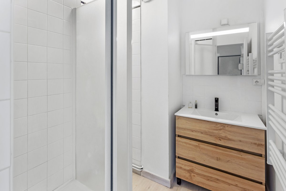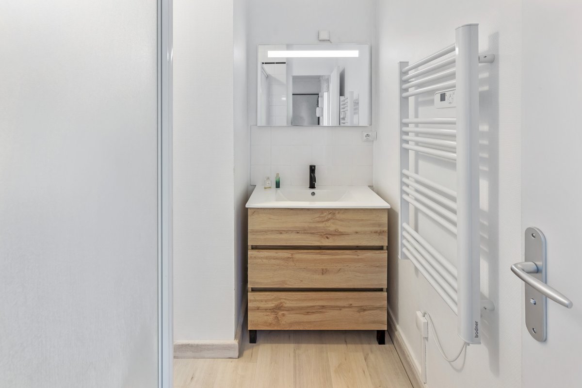 - une salle d’eau avec meuble vasque, douche, miroir éclairant