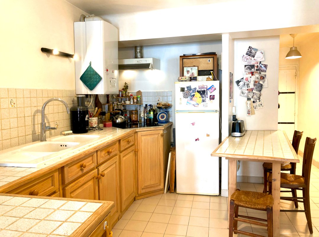 Cuisine de 13 m², fonctionnelle et en bon état, avec nombreux rangements et espace repas.