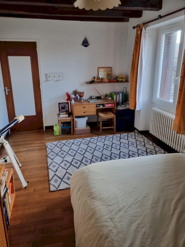 - À l’étage : 3 chambres, petite pièce à usage multiple (chambre de bébé, atelier couture, salle de jeu…), wc, salle de bains à rénover ;