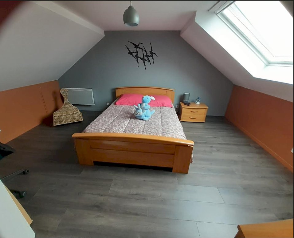 A l'étage : Palier avec coin lecture, 2 grandes chambres de 16 et 18 m2 au sol, pièce WC avec lavabo.