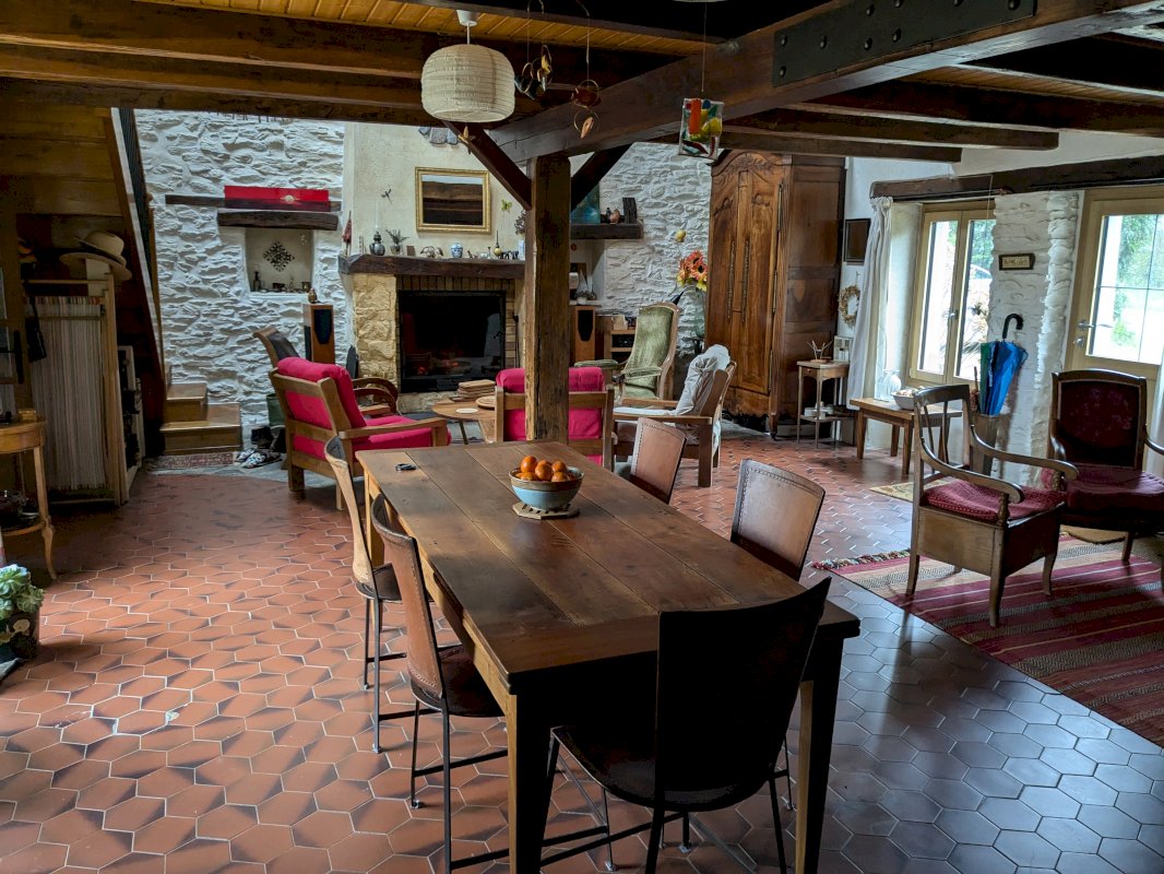 Rez-de-chaussée : grand salon/séjour de 45 m² avec cheminée insert, chambre de 14 m², cuisine très lumineuse de 12,5 m², espace de rangement, salle d'eau avec wc et petite buanderie.