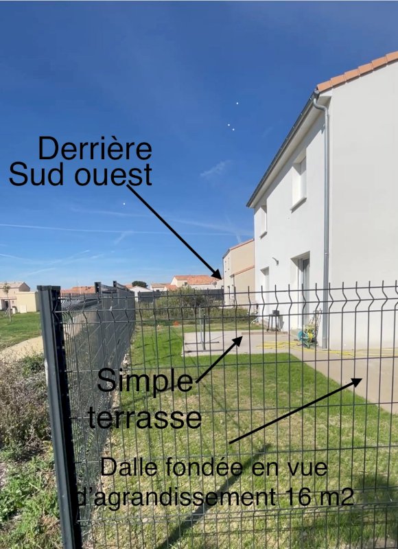 Jardin terrain 309 m². Deux place de parking goudronnée devant garage faisant partie de la propriété de la maison. Le jardin clôturé. Une terrasse de 28 m². Plus 1 dalle de fondation de 16 m² en vue d'agrandissement si besoin.