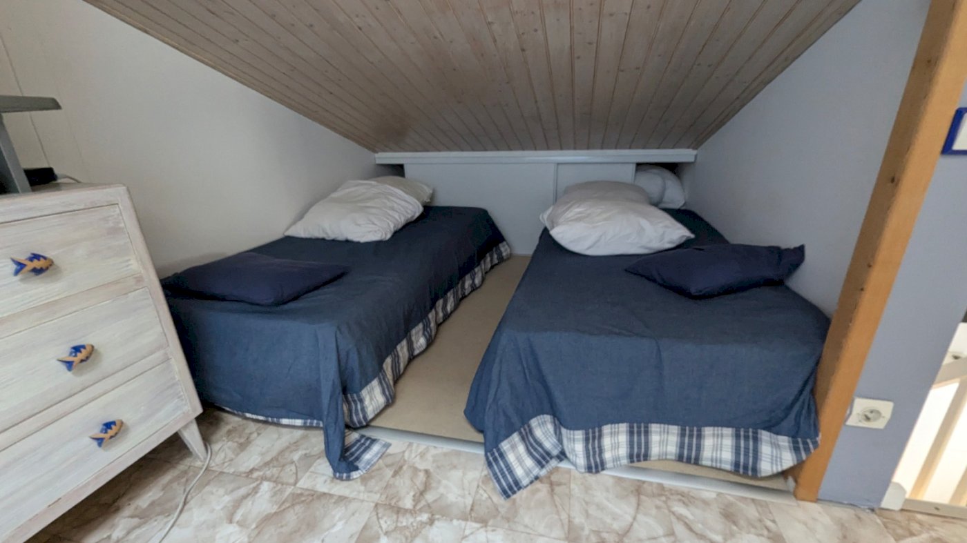 ✨ A l’étage une mezzanine très agréable offrant la possibilité de 4 couchages (1 BZ + 2 lits individuels), avec un espace pour rangements sous pente.