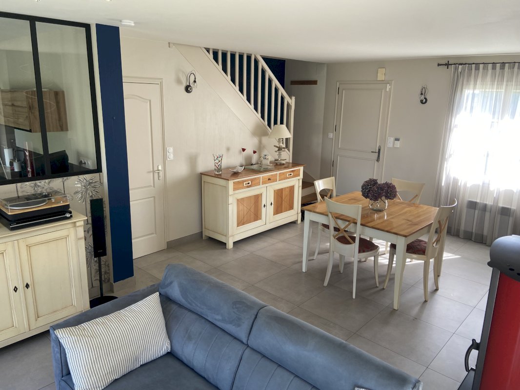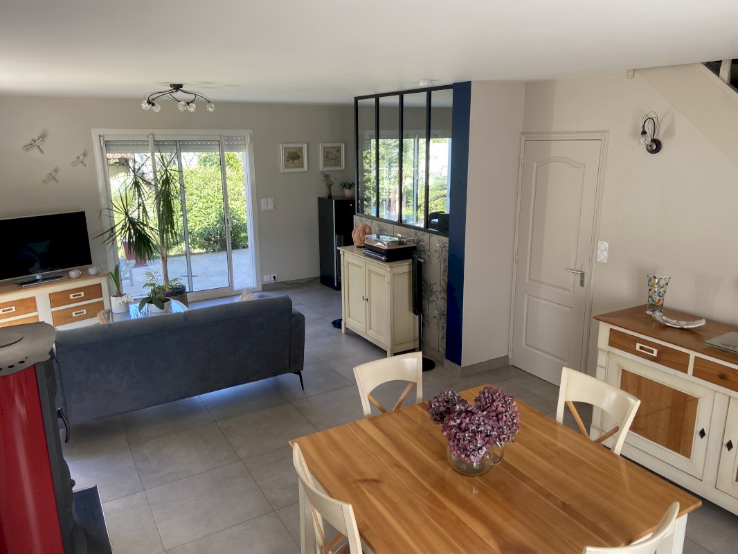 Belle pièce de vie de 32,30 m² (Salon/Séjour) avec cuisine (15,62 m²) semi ouverte par une verrière, poêle à bois dans le salon.