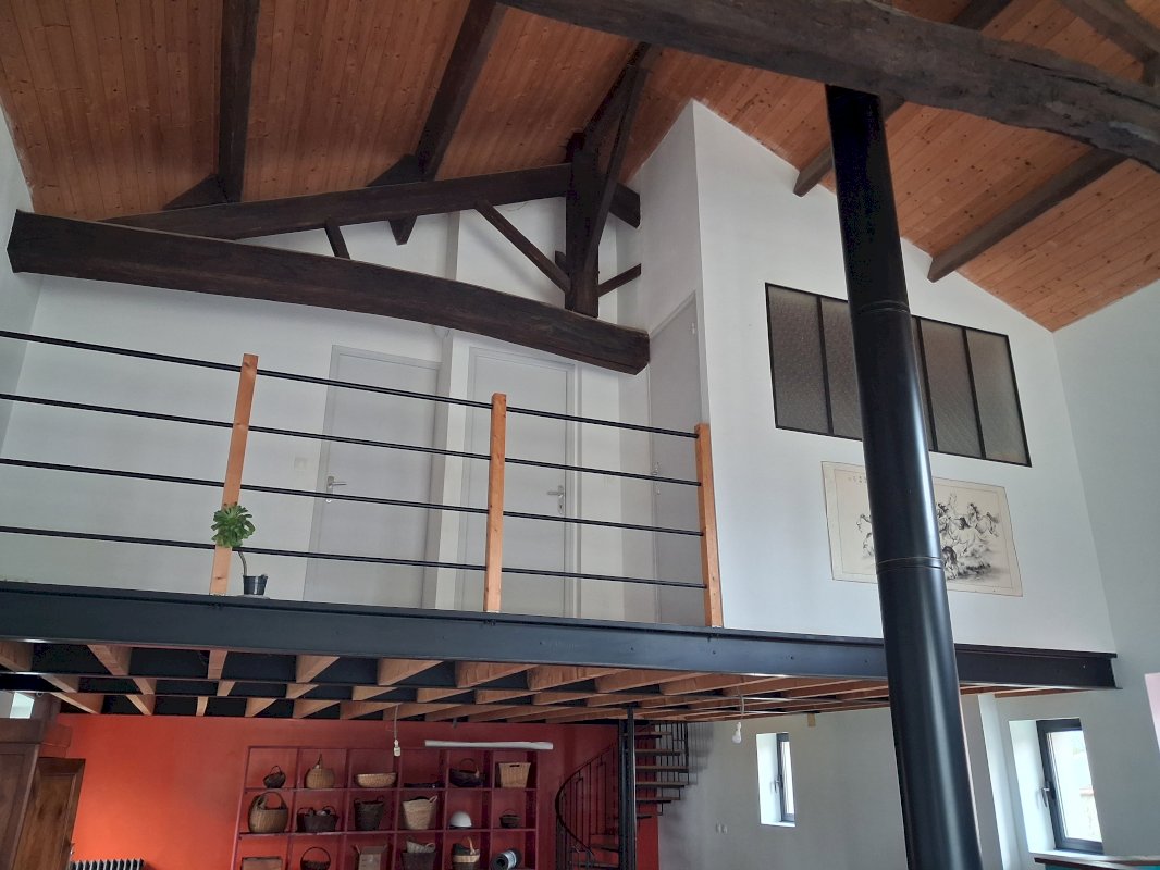 Maison style loft grands volumes, poutres apparentes, pièce de vie 100 m² avec poêle à bois central, mezzanine contenant deux chambres, un balcon intérieur et une salle de bain.