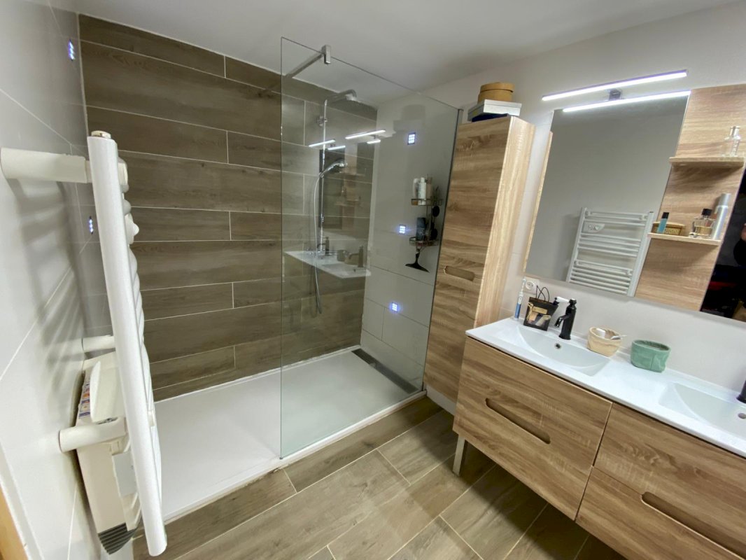 La maison se compose au rez-de-chaussée d’une grande pièce de vie lumineuse de 70 m² et d’une salle d’eau avec WC. En rez-de-jardin, vous trouverez une suite parentale de 34 m² avec salle de bain privative, une chambre, un WC indépendant et un cellier.