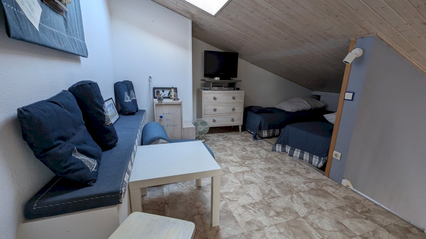 ✨ A l’étage une mezzanine très agréable offrant la possibilité de 4 couchages (1 BZ + 2 lits individuels), avec un espace pour rangements sous pente.