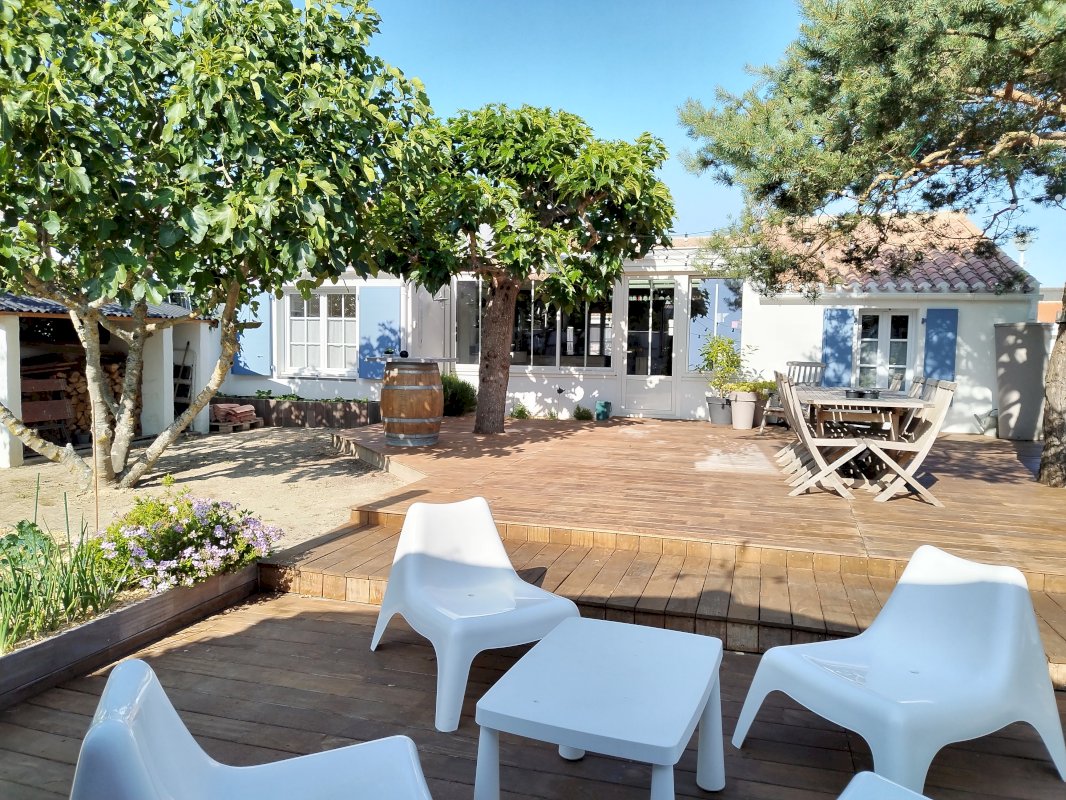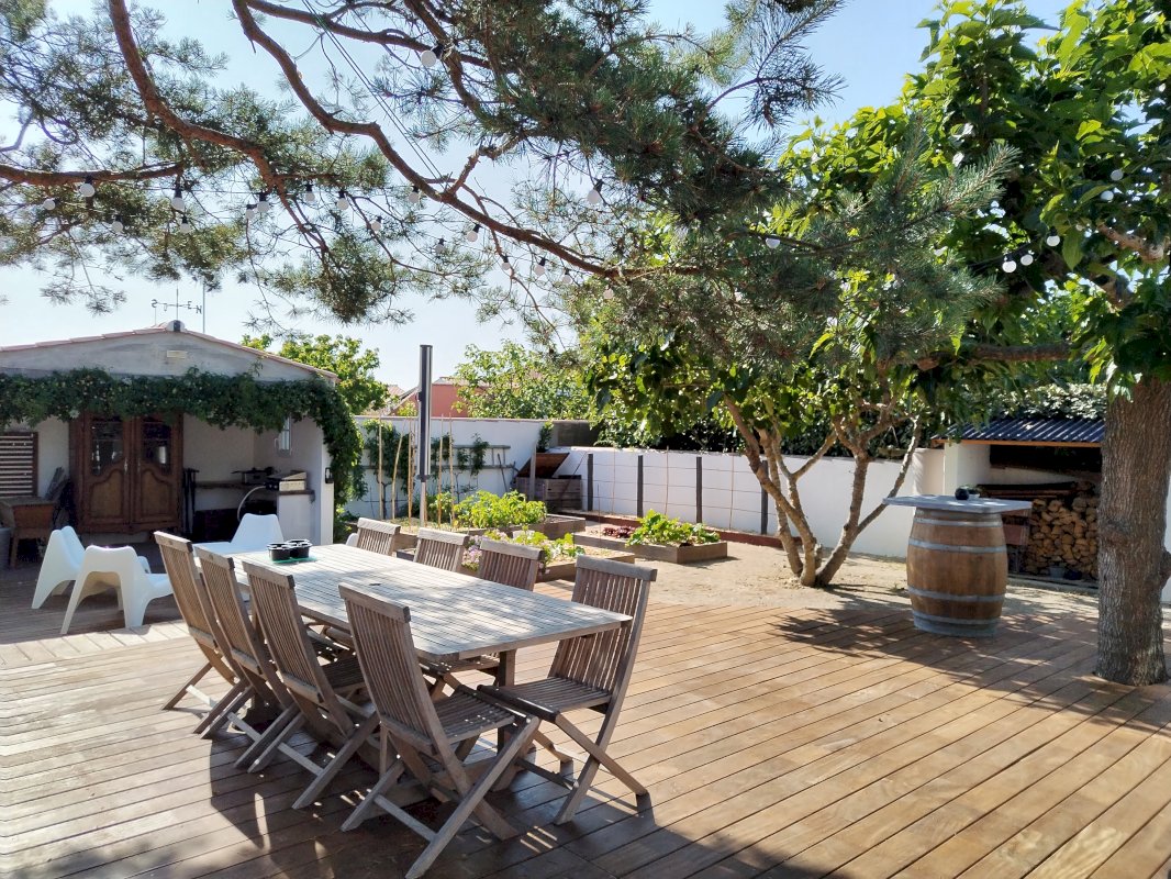 Grande terrasse ombragée par arbres exposée ouest avec une cuisine d'été sous préau.