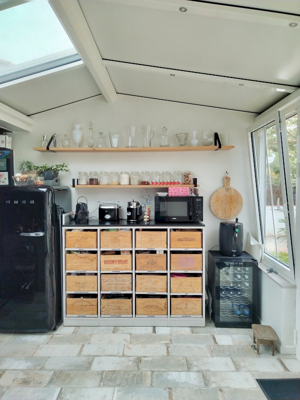 Pièce de vie de 40 m² avec cuisine équipée sous véranda ouvrant sur le jardin.