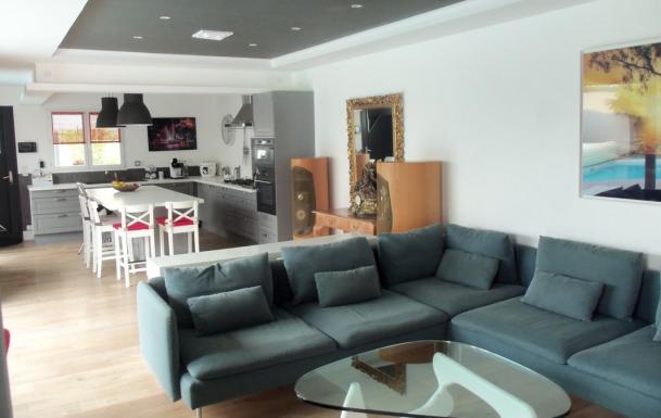 - cuisine équipée (frigo 1 porte, congélateur 1 porte, four et micro-ondes encastrés, lave vaisselle, plaque 5 feux gaz et hotte) ouverte sur salon/séjour 45 m²,