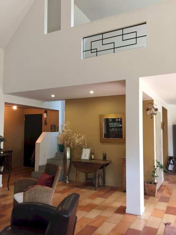 Elle bénéficie de grands volumes avec une belle mezzanine et chauffage au poêle. Une chambre au rdc avec sa sdb et trois chambres à l'étage et une sdb 185 m2 surface au sol.