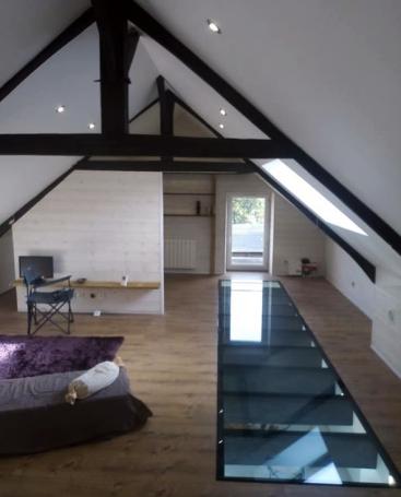 - Grande pièce de vie avec poêle à bois et cuisine de qualité équipée en électroménager. Plancher de verre de 5 mètres de long.