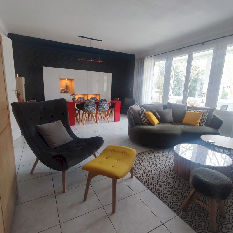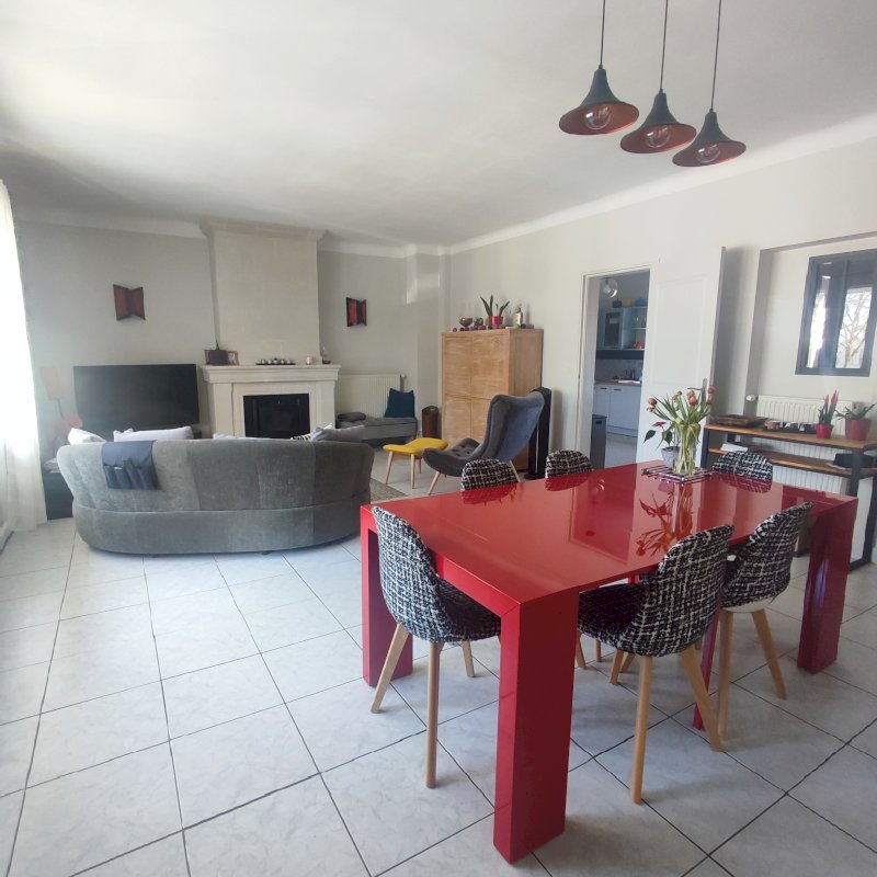 - une grande pièce de vie lumineuse avec loggia, cheminée tuffeau avec poêle à granulés intégré et une cuisine aménagée