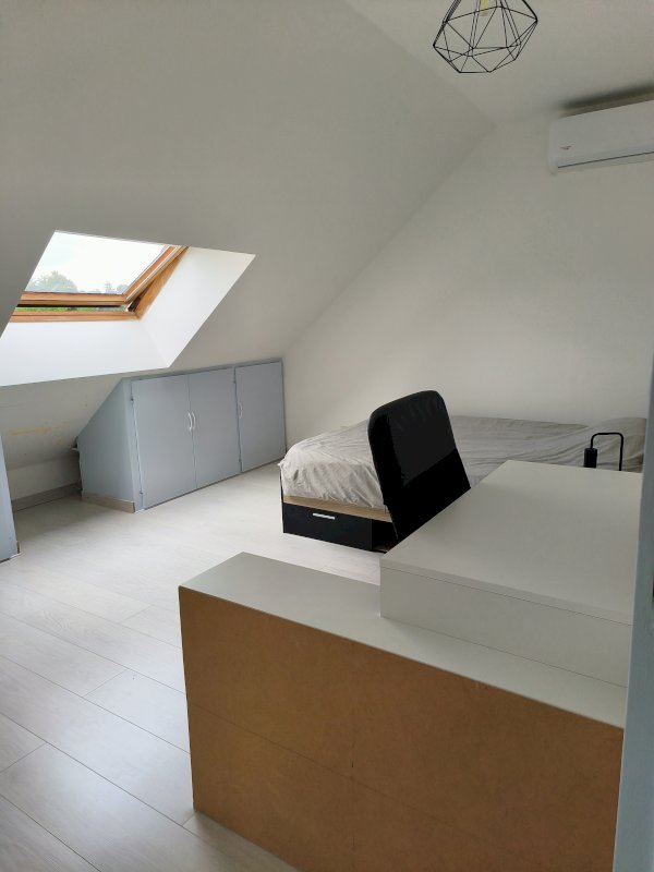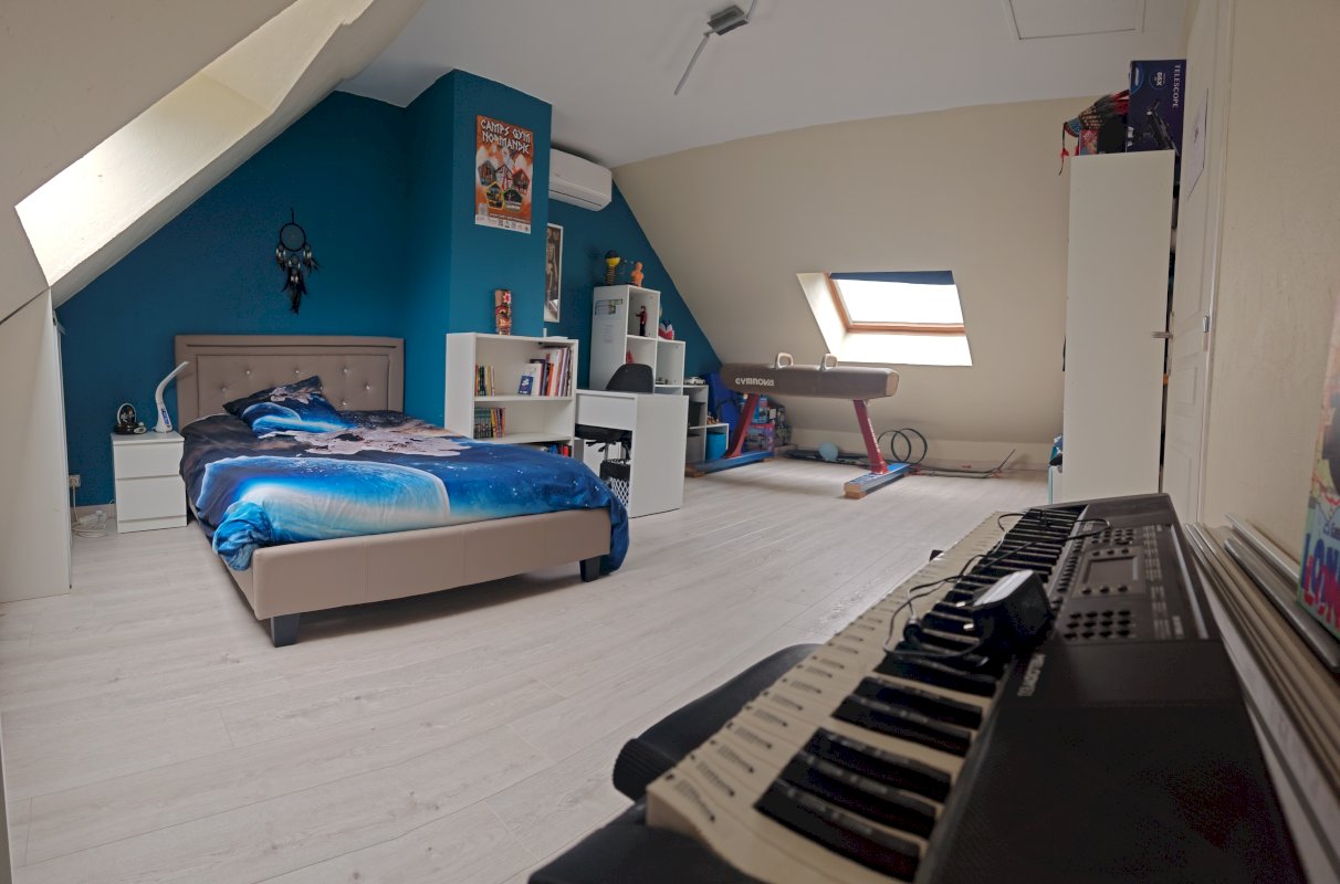 A l'étage, une grande chambre avec 2 velux (28 m²), et un espace composé d'un espace bureau (12,5 m²), qui ouvre sur une salle d'eau avec wc (9 m²), et sur deux autres chambres avec placards (13 m² et 11,5 m²)