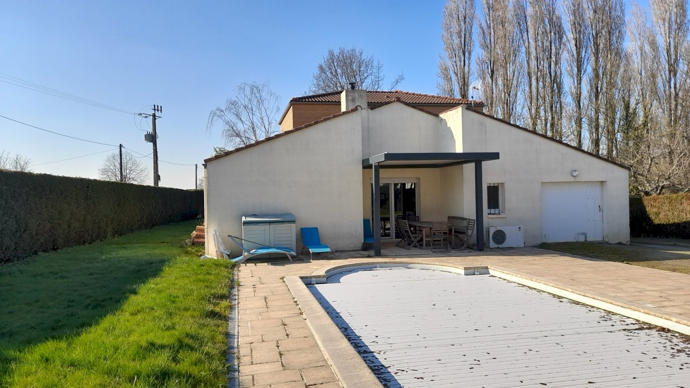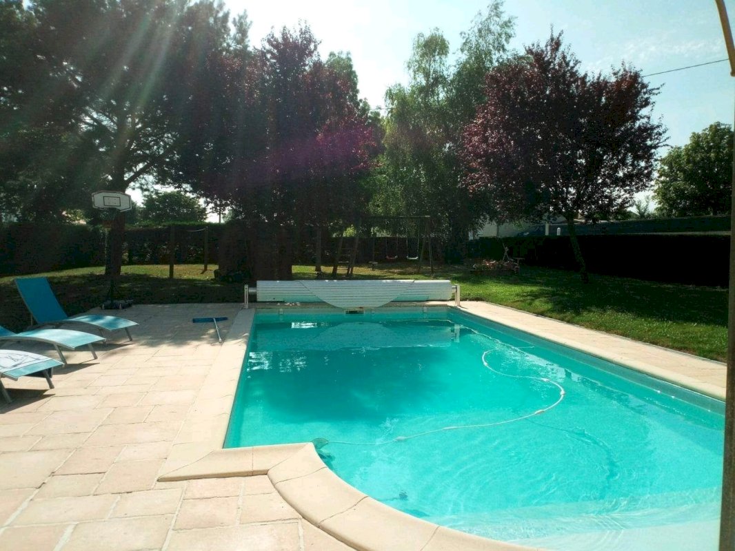 Depuis la cuisine, on accède à une terrasse équipée d'une pergola bio climatique (2021) donnant sur une piscine de 8m*4m chauffée par une pompe à chaleur. Cette dernière nécessite des travaux de rénovation (électrolyse et liner de 2005).