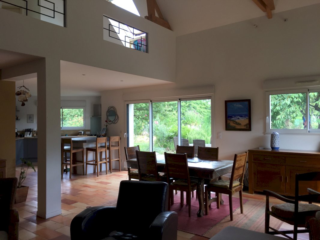 Elle bénéficie de grands volumes avec une belle mezzanine et chauffage au poêle. Une chambre au rdc avec sa sdb et trois chambres à l'étage et une sdb 185 m2 surface au sol.