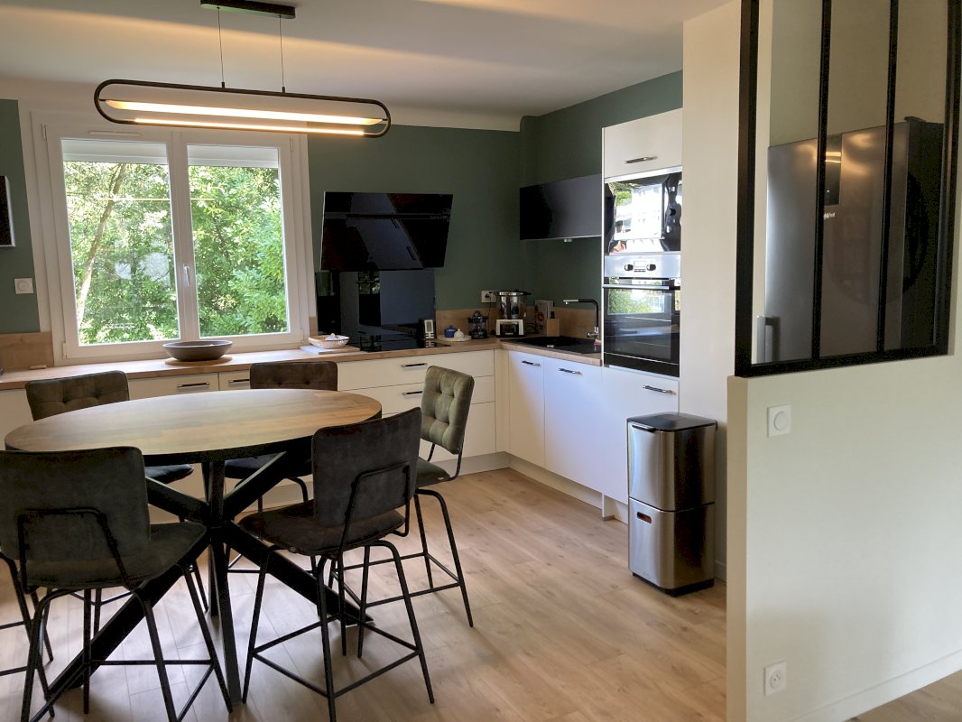 Sa cuisine ouverte aménagée et équipée offre un confort optimal (cuisine très fonctionnelle et design : évier composite noir onyx avec mitigeur, lave-vaisselle, four pyrolyse, Lave-linge (lavant et séchant), Hotte haut de gamme, Plaque induction, Frigidaire congélateur.