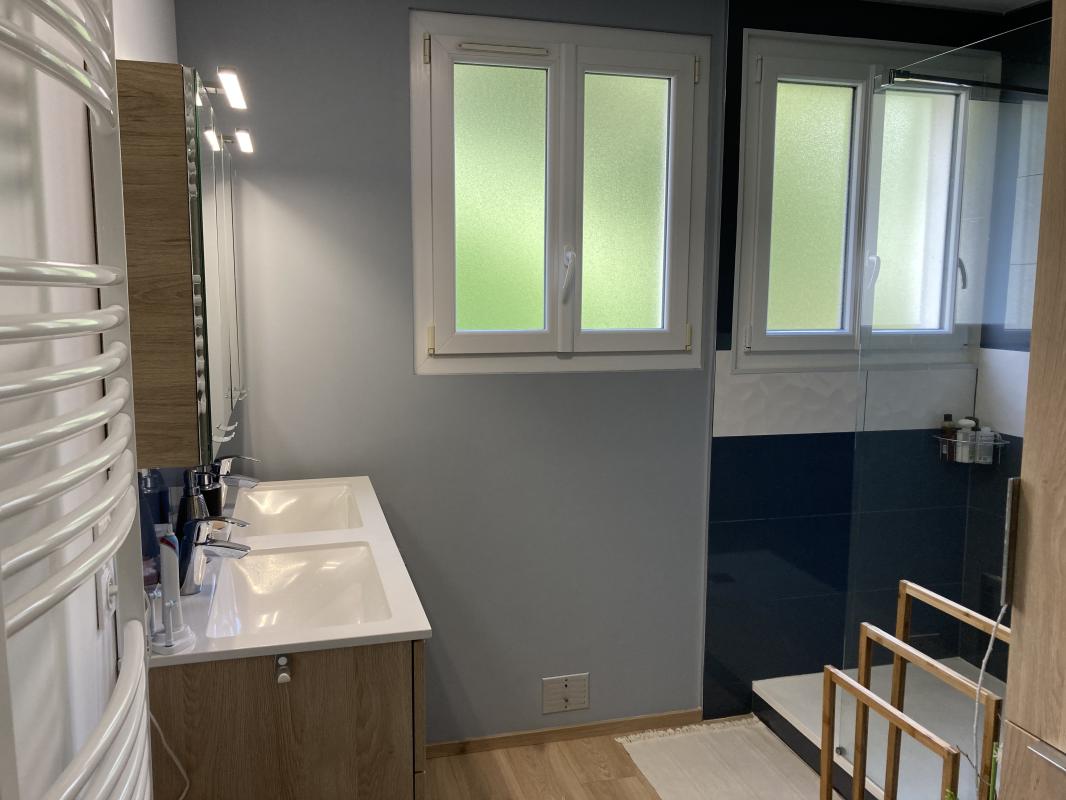 Une salle d’eau avec 2 fenêtres qui allie confort, qualité et esthétique (double vasque, divers rangement, douche avec mitigeur thermostatique).
